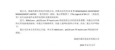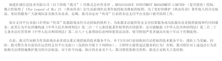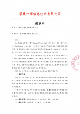 福建撲滿信息技術(shù)有限公司注冊地位于福建省福州市,是國內(nèi)《熱血傳奇》客戶端游戲獨占性版權(quán)人。對《熱血傳奇》客戶端游戲擁有全部版權(quán),并有權(quán)基于版權(quán)權(quán)利進行該游戲維權(quán)。株式會社傳奇IP (以下簡稱傳奇IP )對《The Legend of Mir 2》(中文名為“熱血傳奇"、或“傳奇”、“傳奇2”、“MIR II”)游戲(以下稱為 “授權(quán)作品”) 共同享有充分、完整且有效的著作權(quán)。經(jīng)傳奇IP授權(quán) , RENAISSANCE INVESTMENT MANAGEMENT LIMITED (以下簡稱 RENAISSANCE Ltd.)有權(quán)在中國大陸地區(qū)獨占性地對授權(quán)作品的網(wǎng)絡客戶端游戲進行開發(fā)、 發(fā)行、管理、宣傳、推廣和運營,針對授權(quán)作品的侵權(quán)游戲及侵權(quán)方,RENAISSANCE Ltd.有權(quán)采取必要的措施,并有權(quán)將前述權(quán)利分授權(quán)給第三人。福建撲滿信息技術(shù)有限公司經(jīng)RENAISSANCE Ltd.授權(quán),獲得上述權(quán)利,有權(quán)在中國大陸地區(qū)獨占性地對授權(quán)作品的網(wǎng)絡客戶端游戲進行開發(fā)、發(fā)行、管理、宣傳、推廣和運營,并有權(quán)對侵權(quán)行為/主體采取維權(quán)措施。